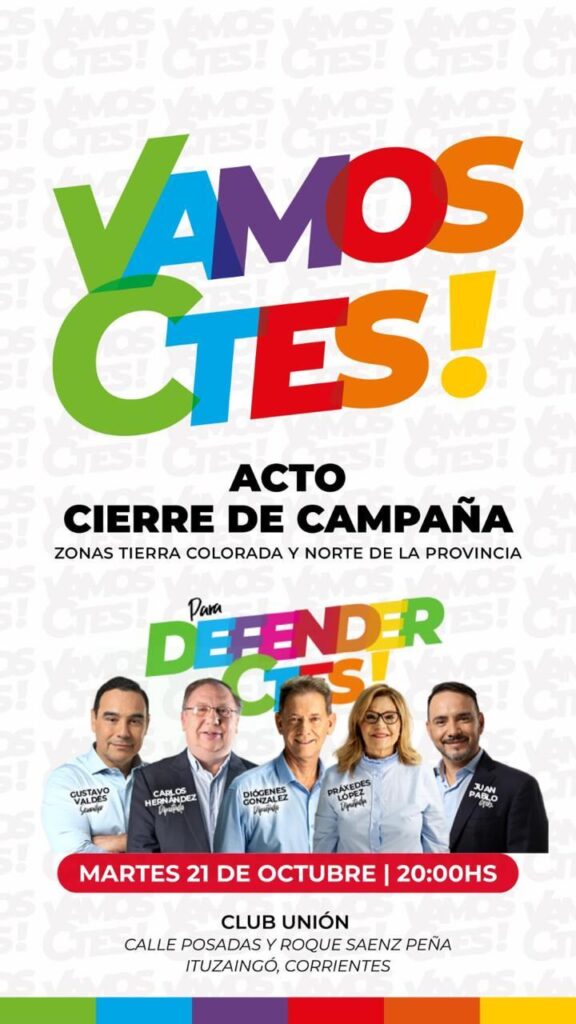 El martes 21 de octubre a las 20:00 hs, el espacio Vamos Ctes! realizará su acto de cierre de campaña para las zonas Tierra Colorada y Norte de la provincia.